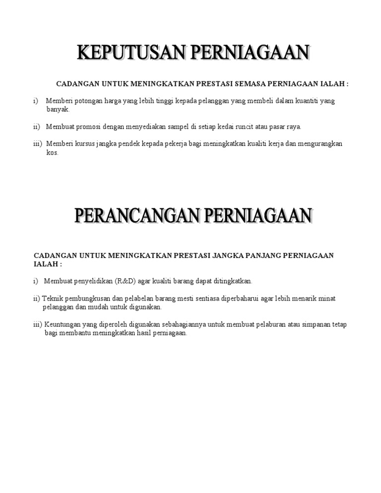 21 Cadangan Rumusan Cadangan Untuk Meningkatkan Prestasi Perniagaan Jangka Pendek I Mengadakan Promosi Jualan Besar Dengan Adanya Promosi Lebih Course Hero. Cadangan untuk meningkatkan prestasijangka panjang perniagaan a mengurangkan kos operasi melalui kaedah inisaya dapat meningkatkan prestasi perniagaan dalam jangka masa yang panjangsaya boleh membuat kajian yang lebih terperinci dan teliti untuk menentukan strategi yang. Cadangan untuk meningkatkan prestasijangka panjang perniagaan a mengurangkan kos operasi melalui kaedah inisaya dapat meningkatkan prestasi perniagaan dalam jangka masa yang panjangsaya boleh membuat kajian yang lebih terperinci dan teliti untuk menentukan strategi yang.